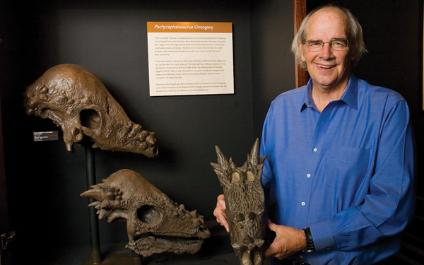 图注:开心的杰克·霍纳展示不同种类(他认为是不同年龄阶段)的肿头龙类头骨,图片来自网络