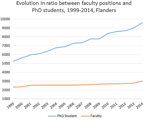 但是现实是,学术界根本无法提供足够的职位。实际上,这么多年来,学术界职位的数量是比较恒定的,但是博士研究生的数量是井喷的[2]: