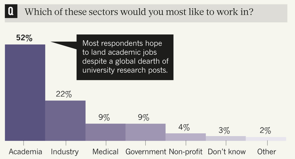 在读博早期,高达 52% 的人希望未来在学术界发展(信心满满),90% 以上的人希望做跟科研有关的工作: