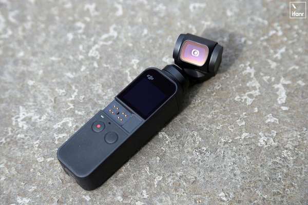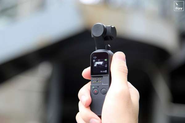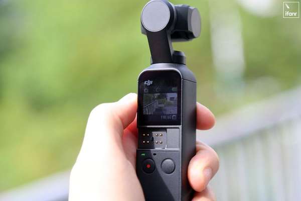 相机的大小跟大拇指差不多,延用大疆航拍无人机上的祖传三轴机械云台。机身正面分布着触控显示屏、拓展接口、拍摄按键、电源 / 功能按键和一个收音孔。
