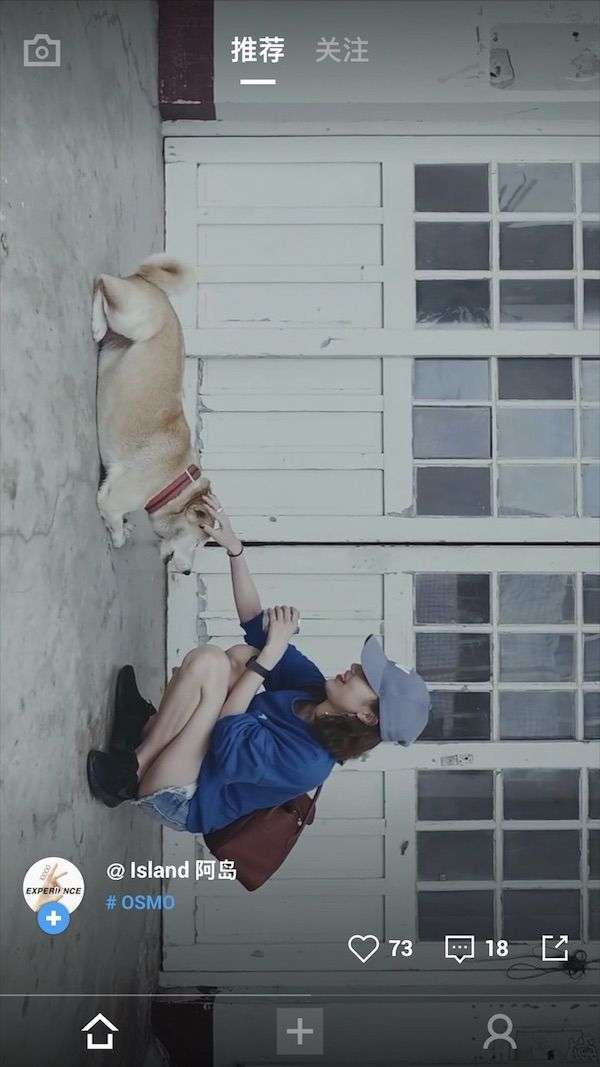 DJI Mimo 目前只能与口袋灵眸连接,应用还没有正式上线。我们拿到的 app,乍一眼看上去,感觉跟抖音这些短视频应用的 UI 有点像,整体给人的感觉就是一个短视频编辑和分享的社区。
