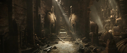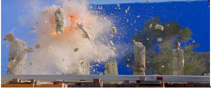 由于这个场景涉及到了爆破,所以柱子和雕像的爆炸倒塌方向和破碎效果都要进行提前设计。