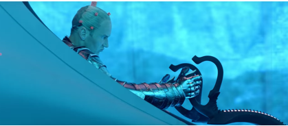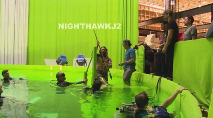 演员被穿着全绿色套装的机组成员定位在控制的设备上,周围是绿色屏幕,整个水下环境都是以数字方式创建的。所以,即使再复杂的镜头,演员都是被真实拍摄的,除了他们的头发和环境。