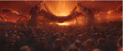 亚瑟第一次与弟弟奥姆王决斗的场景涉及到了两个部分,一个在充满岩浆的备战室,一个在正式决斗的台上。显然,如此浩大的决斗场与观众都是后期添加上去的。