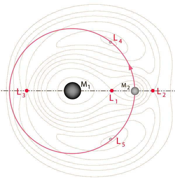 再有就是地月系统、日地系统各自的几个拉格朗日点:在这几个地方,卫星可以较长时间维持较低的轨道速度,可以近似看做相对地球静止不动,从而可以实现对目标天体较长时间的持续曝光,因此也是经常被用于放置天文卫星的地方。