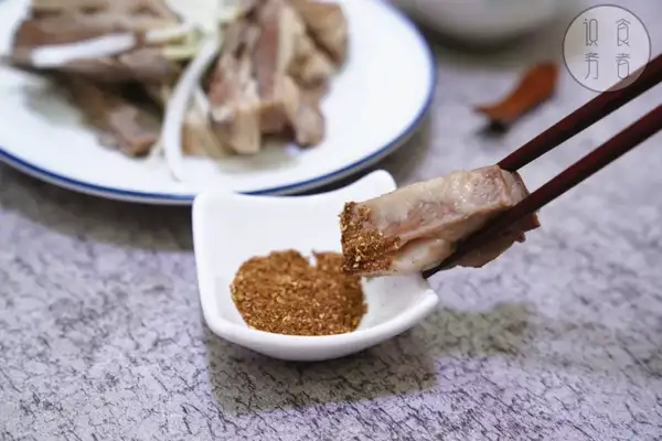 捞起羊肉,撒上配菜,配一碟花椒盐,就可以上菜了。