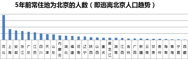 在 2010 年第六次全国普查中,有一栏数据为"全国按现住地和五年前常住地分的人口",根据这个数据,我们可以推算出"5 年前常住地为北京的人口",即真正践行了逃离北京的人口趋势。