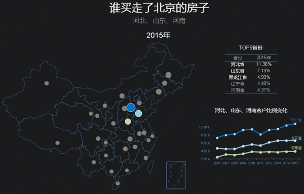 从数据来看,2006 年河北人在京购房比例为 7.8%,十年来持续上升,2015 年已涨至 11.3%,不仅占比最高,而且涨幅最大。山东、东北、河南紧随其后。