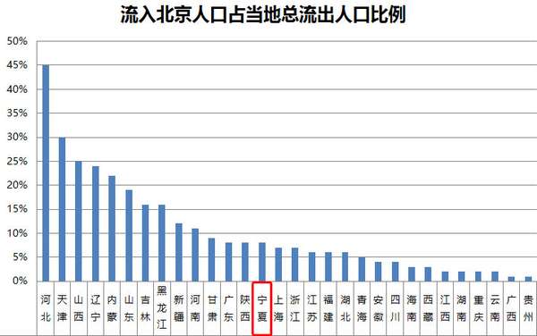 其实只看该省入京的绝对数量,已经基本能发现一些端倪,但还不够确信。我们再加上一个数据佐证,即"流入北京人口占当地总流出人口的比例",来看看帝都对这个省的人到底有多少吸引力——