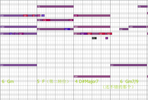 这个也听着还行,所以我感觉可能编曲在和声上也不算太糟糕(也是因为曲子到这里仍然是以钢琴的柱式为主。曲子后面糟糕的声部分配就在听感上打了折扣)