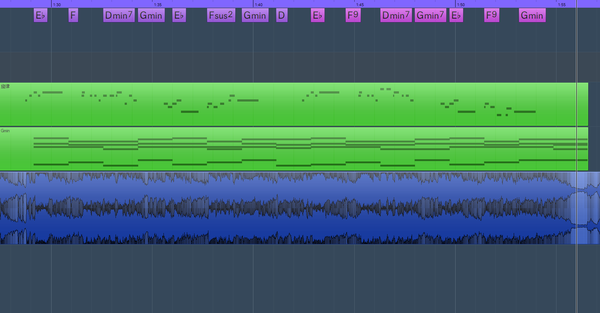 图中所示部分,不同颜色的和弦区域分别为粉色前奏,黄色和橙色第一段主歌循环两遍,青色和绿色第二段主歌循环两遍,紫色和粉色为两段副歌。降 B 调。