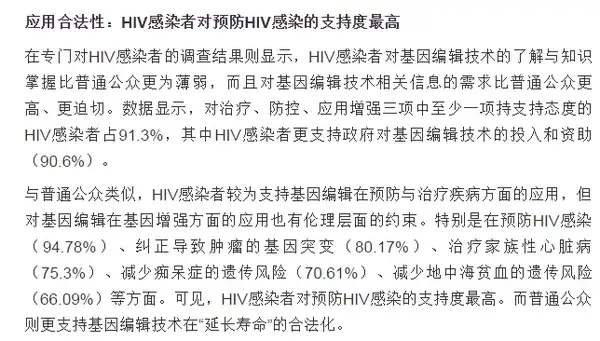此前,来自中山大学的一组学者针对公众对基因编辑的态度进行问卷调查,HIV 感染者对基因编辑技术期望值比普通公众要更高。