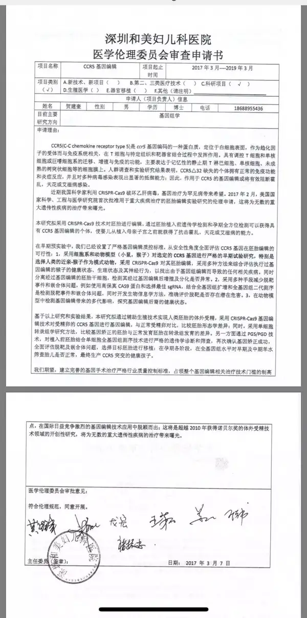 1、伦理申请是深圳和美妇儿医院医学伦理委员会批准的,但提供胚胎的是另外四家医院。根据美联社报道,贺建奎在 11 月 8 日出示临床试验的官方许可。您对此如何评论?
