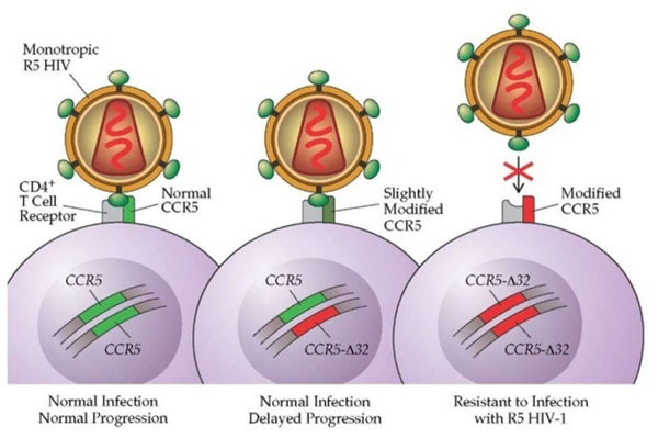 因为人类中有很少数人先天就是 HIV 免疫的。因为它们编码 CCR5 蛋白的两条等位基因都是变异的(CCR5-δ32)。也就是说,这些 HIV 免疫的人类个体是变异基因的纯合个体: