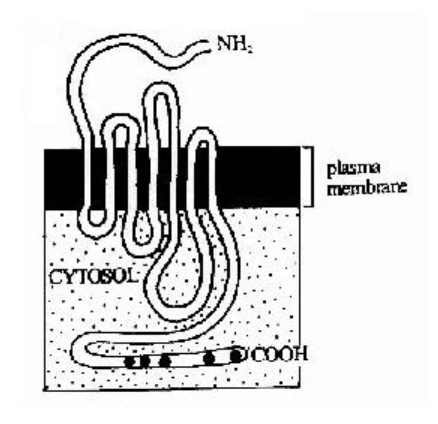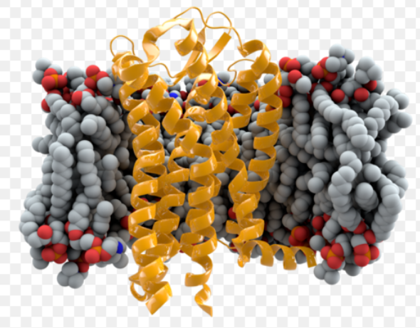 CCR5 是人类 CCR5 基因表达的蛋白质,存在于细胞表面,是 G 蛋白偶联受体中的一种。它就像一条身体细长的蛟龙,躯干七次跨过水面那样: