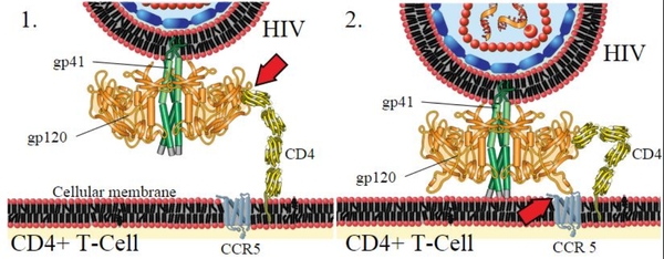 下图展示的是 CCR5 如何帮助 GP120 更加紧密的结合到细胞表面
