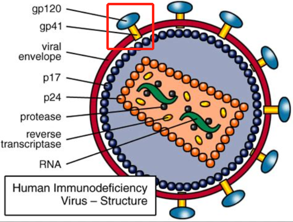 HIV 病毒表面有一些像蘑菇头一样的蛋白质结构,这可以说是他们的身份识别卡: