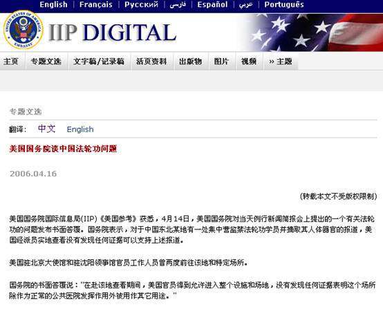 美国政府在其驻华使领馆官员两次实地探访、查看法轮功所谓的"集中营"后,表示:没有发现任何证据可以支持法轮功的"活摘器官"指控。
