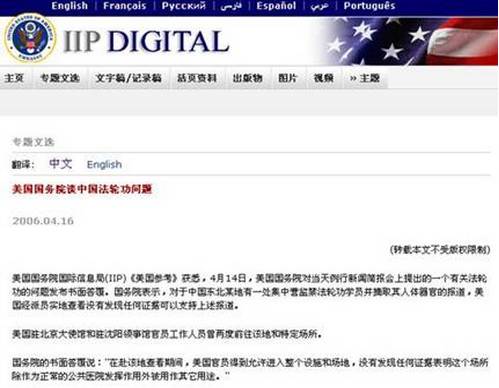 2006年4月16日,美国国务院国际信息局(IIP)网站发表《美国国务院谈中国法轮功问题》称:"国务院表示,对于中国东北某地有一处集中营监禁法轮功学员并摘取其人体器官的报道,美国经派员实地查看,没有发现任何证据可以支持上述报道","美国驻北京大使馆和驻沈阳领事馆官员工作人员曾两度前往该地和特定场所。在赴该地查看期间,美国官员得到允许进入整个设施和场地,没有发现任何证据表明这个场所除作为正常的公共医院发挥作用外被用作其它用途。"