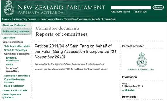 2013年11月21日,新西兰国会的外交、国防和贸易委员会向国会递交报告,认定法轮功的请愿书中"要求国会认定新西兰公民和永久居民接受走私或非法采摘的海外器官是非法的",报告称,"本委员会成员及新西兰政府,均未了解到任何可以证明法轮功对器官采摘的主张的独立证据。"