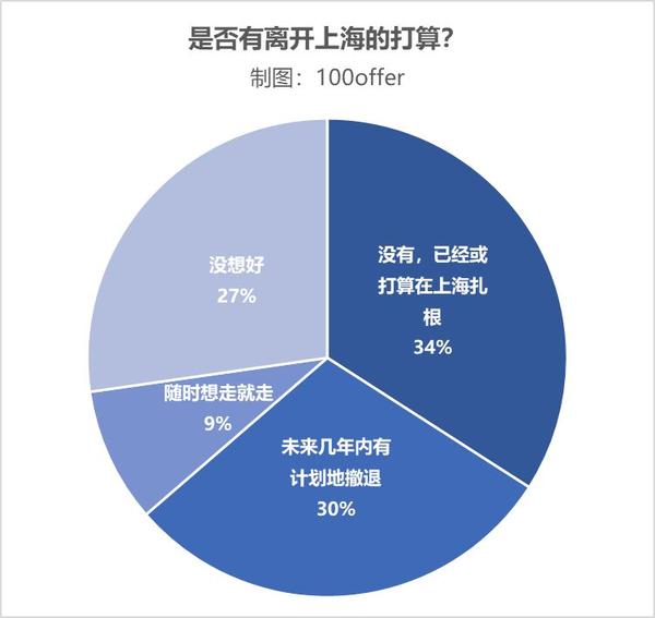 在 100offer 的随机抽样调查中,34%的互联网人确定扎根上海,30%的人计划在未来几年离开,不过也有 27%的人表示没有想好。