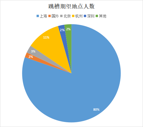 100offer 平台 2018 年 Q1-Q3 上海互联网候选人中,跳槽后想要继续留在上海的候选人占 80%,在另外的 20%换城市跳槽者中,有 16.3%的候选人表示有合适的机会,依然会考虑留在上海,只有 3.7%的候选人表示坚决不留在上海。