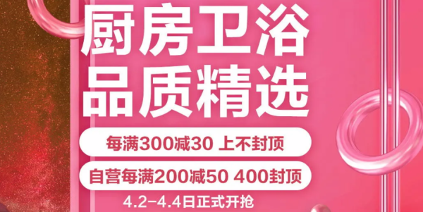 4.2-4.4正式开抢~京东家装节本次促销从3月28日开启,一直持续到5月5日,厨房卫浴会场(PC端、APP端)每满300-30上不封顶,自营每满200-50,400封顶;4.2-4.4正式开抢~领券建材满99-30、满499-150、满999-300、厨卫满999-100、满299-100;